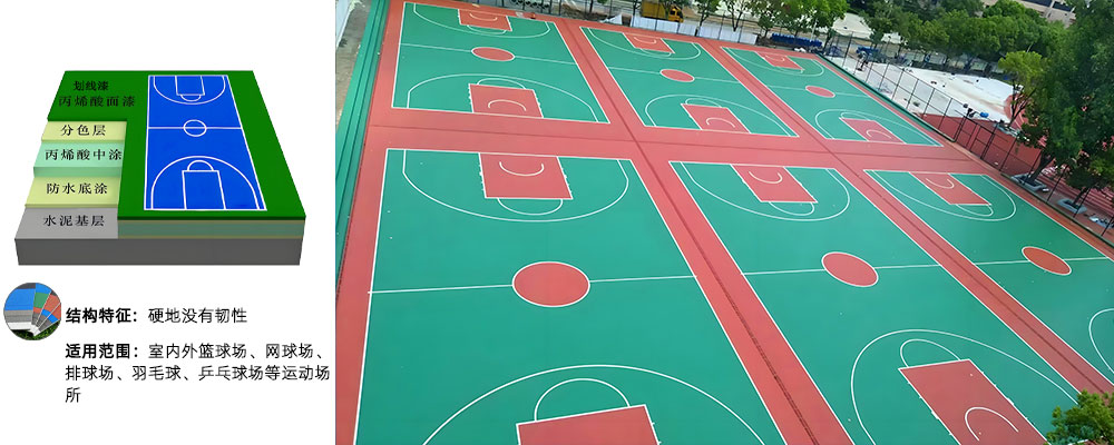 丙烯酸涂层系统是完全不含石棉、铅或水银等化合物,合乎环保原则。绿色环保、高度抗紫外光,颜色持久深入,不退色,不脱落。保养容易,维修费用低,在任何气候条件下都坚固耐用。多颜色可选,使用寿命长。面层有效舒缓冲力,降低对运动员的伤害及疲劳!极好环保性、耐候性、耐磨性及成本低等众多优点!