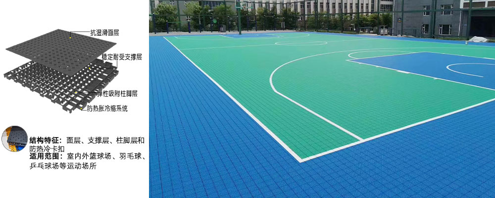 悬浮式拼装运动地板采用高强度抗冲聚丙烯材料,是四代运动场地面层材料,成品为块状,可直接铺装在水泥或沥青的基础表面,无需胶水粘接,每一块地板之间用锁扣进行连接,安装简单,还可随意拆卸。具有防潮防水、安拆维护方便、减震降噪、节能美观等优点!